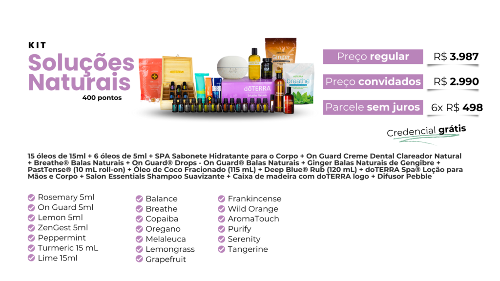Desde os Óleos Essenciais Individuais, Blends de Óleos Essenciais, bem como os kits dōTERRA: Kits (Kit Soluções Naturais, Kit Essencial para o Lar, Kit Brasil Living, Kit Primeiros Cuidados, Kit Início Rápido), Acessórios e Coleções, como nosso incrível Difusor Petal doTERRA.